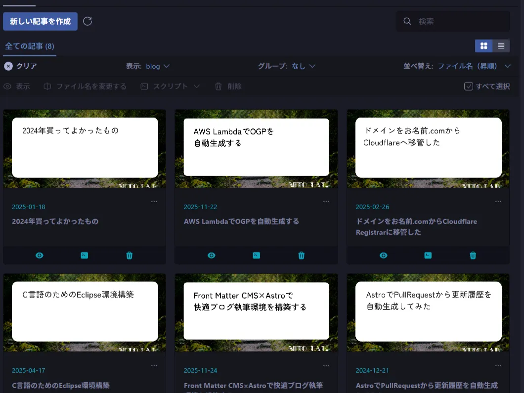各記事のOGP画像、公開日、タイトルが一覧で見れます。クリックすると各記事のMarkdownファイルに飛ぶこともできます。