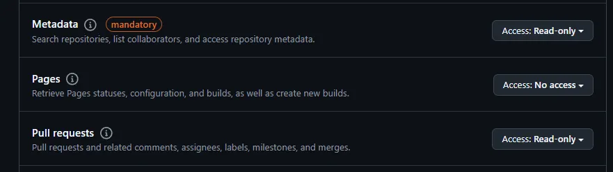そして、Permissions→Repository permissions→Pull requestsをAccess: Read-onlyに設定する。(このとき、Metadataも自動的にRead-onlyになる。)